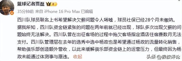 北京时间11月19日,根据篮球记者“贾磊的”报道,四川队球员联名上书希望解决欠薪问题令人唏嘘,球员社保已经28个月未缴纳。