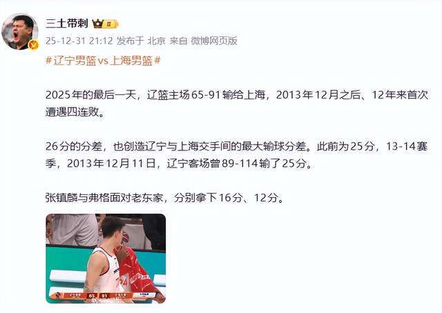 北京媒体人三土带刺老师则表示:2025年的最后一天,辽篮主场65-91输给上海,2013年12月之后、12年来首次遭遇四连败。26分的分差,也创造辽宁与上海交手间的最大输球分差。此前为25分,13-14赛季,2013年12月11日,辽宁客场曾89-114输了25分。张镇麟与弗格面对老东家,分别拿下16分、12分。