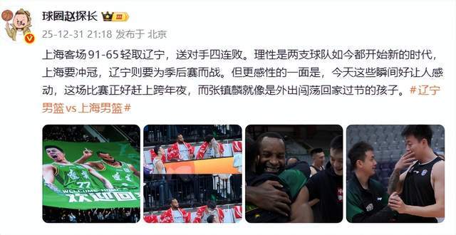 球圈赵探长表示:上海客场91-65轻取辽宁,送对手四连败。理性是两支球队如今都开始新的时代,上海要冲冠,辽宁则要为季后赛而战。但更感性的一面是,今天这些瞬间好让人感动,这场比赛正好赶上跨年夜,而张镇麟就像是外出闯荡回家过节的孩子。