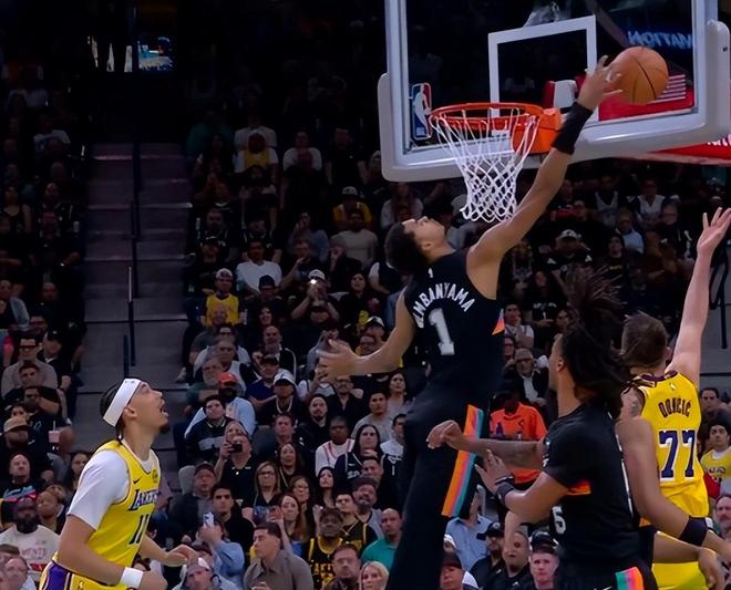 第四节决战,湖人出现本场第15记失误,哈珀反击飞扣得手,福克斯强投三分不中,文班亚马高高跃起完成挂框补扣,马刺领先湖人13分,转播镜头给到替补席的詹姆斯。比赛再无悬念,最终,马刺107-91大胜湖人,终结对手3连胜,湖人遭遇16分惨败。