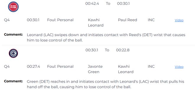 第二次漏判,出现在距离比赛结束还有27.4秒,也就是莱昂纳德抢断完成后不久,活塞队的格林伸手切球,也碰到莱昂纳德的手腕,将他的手从球上拨开,致使莱昂纳德丢球。这同样是一次漏吹的防守犯规,不过,这一球最终出界,球权还在快船手中。