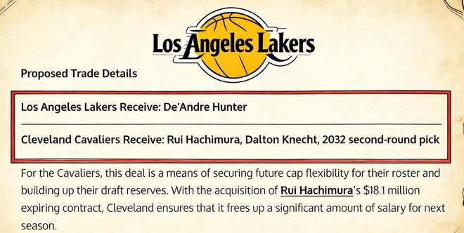 美媒《Fadeaway World》撰文建议,湖人可以考虑打包送出八村垒、克内克特以及2032年的次轮签,从骑士引入亨特。