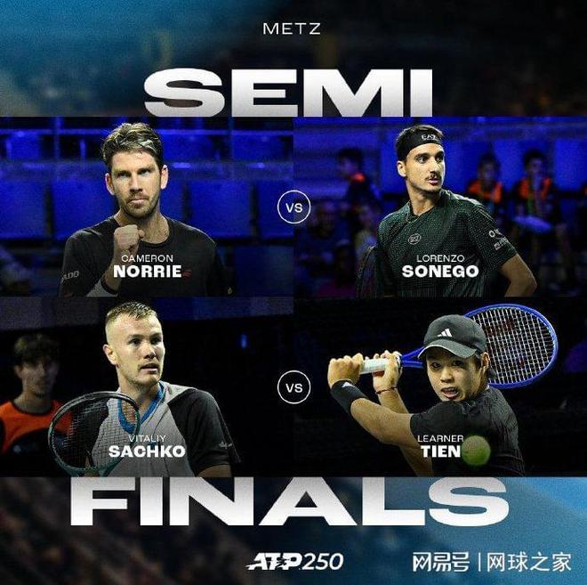 梅兹站:英国名将诺里以4-6 7-6(2) 6-4艰难逆转幸运落败者雅凯,与意大利人索内戈会师半决赛,后者以6-4 7-6(6)战胜德国人阿尔特迈尔;美国新星勒纳-钱后程发力,以5-7 6-2 6-3逆转意大利名将贝雷蒂尼,晋级四强将迎战幸运落败者萨奇科,后者以6-4 3-6 6-4淘汰资格赛球员塔布尔。