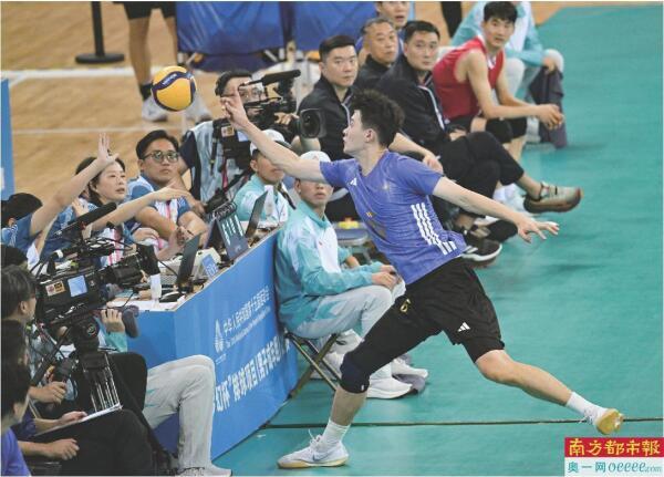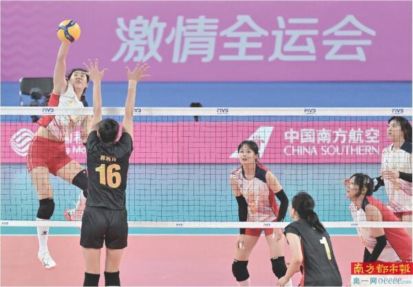 11月11日,香港队球员温迦南在比赛中。当日,在广东江门举行的第十五届全国运动会排球男子成年组小组赛A组比赛中,四川队3比0战胜香港队。 11月13日,花样游泳项目集体技术