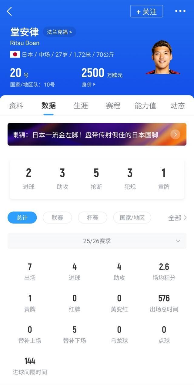 今年夏窗在以9500万欧高价出售埃基蒂克后,法兰克福2100万欧转会费签下堂安律,本赛季至今,堂安律7场比赛已经贡献4球4助,目前身价2500万欧。