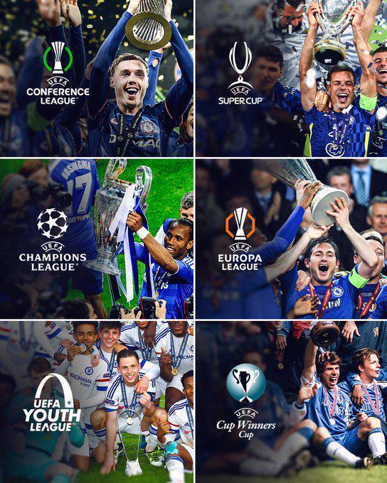 在24/25赛季夺得欧协联冠军后,切尔西成为首支夺得欧冠、欧联、欧协联、优胜者杯、欧洲超级杯、青年欧冠等所有欧战冠军的俱乐部。