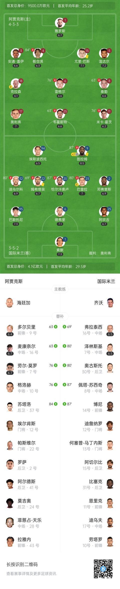 9月18日讯 北京时间9月18日凌晨3:00,欧冠联赛阶段第1轮,阿贾克斯坐镇约翰-克鲁伊夫球场迎战国际米兰。上半场小图拉姆造点被VAR取消,索默扑单刀,尾声阶段恰尔汗奥卢助攻小图拉姆