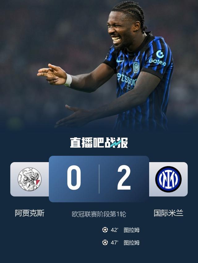 9月18日讯 北京时间9月18日凌晨3:00,欧冠联赛阶段第1轮,阿贾克斯坐镇约翰-克鲁伊夫球场迎战国际米兰。上半场小图拉姆造点被VAR取消,索默扑单刀,尾声阶段恰尔汗奥卢助攻小图拉姆头球破门,国米暂1-0阿贾克斯;下半场恰尔汗奥卢助攻小图拉姆再下一城,最终国米2-0阿贾克斯,取得欧冠开门红。