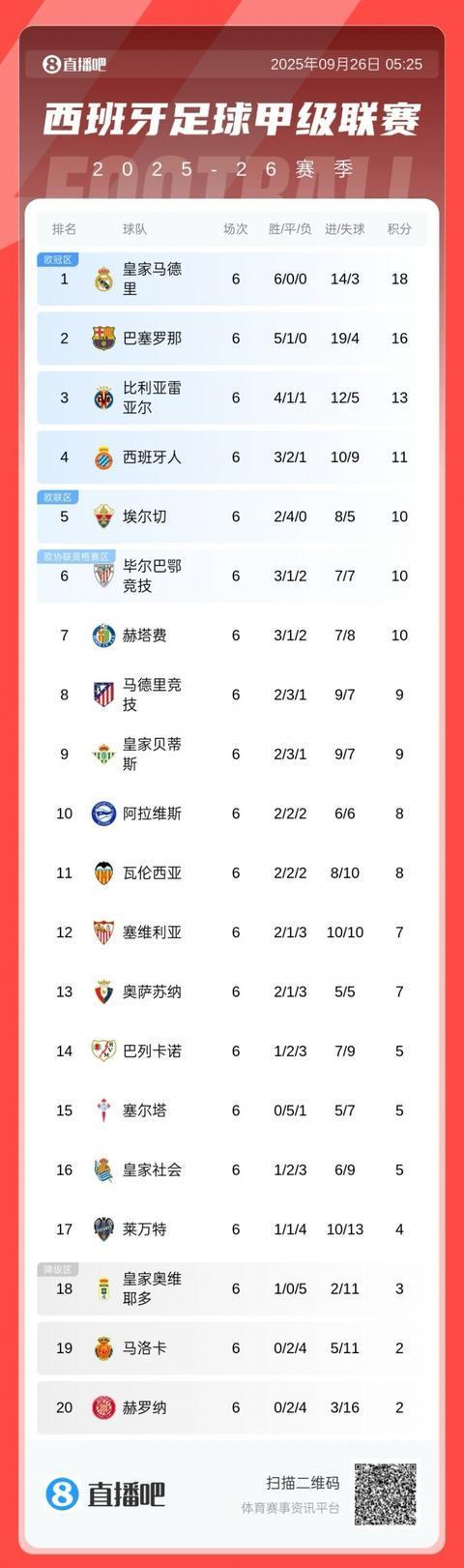 09月26日讯 西甲第6轮,巴塞罗那客场3-1逆转皇家奥维耶多,本场过后的西甲积分榜情况如图所示。