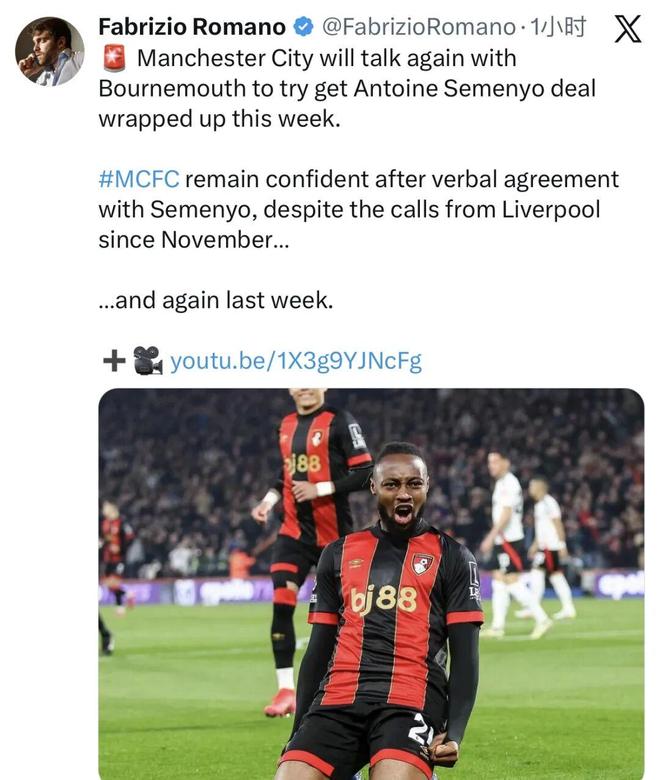 据名记罗马诺的最新消息,曼城将再次与伯恩茅斯谈判,力争在本周敲定塞梅尼奥交易。“曼城与塞梅尼奥已经达成协议,曼城对此交易充满信心,尽管利物浦从11月就开始接触球员,并且上周