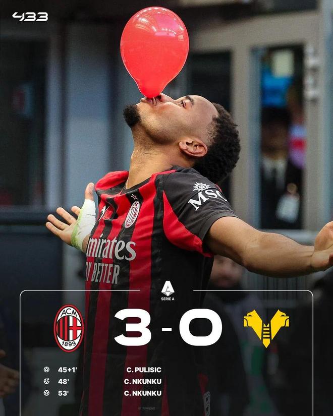 易边再战,恩昆库开场后造点并主罚命中打入个人意甲首球,随后又补射空门完成梅开二度。最终,米兰3-0战胜维罗纳。