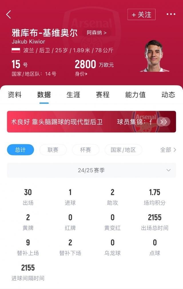 基维奥尔现年25岁,波兰后卫,上赛季各赛事代表阿森纳出场30次,贡献1球2助。目前球员德转身价为2800万欧元。