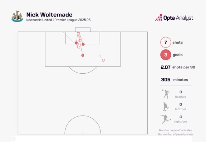 尽管因脱衣庆祝染红略显冲动,但整体表现十分亮眼。他的3个非点球英超进球在联赛中名列前茅,场均非点球预期进球值达0.45,高居队内榜首。