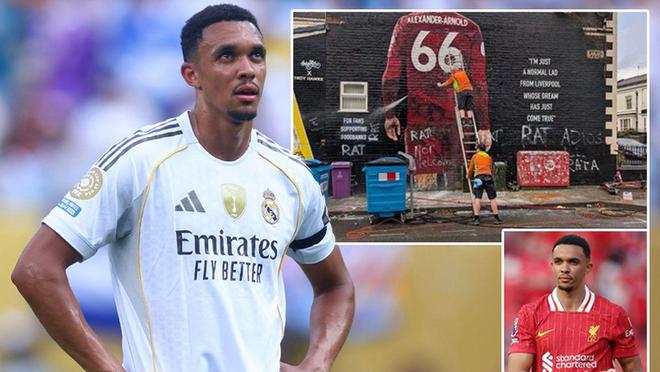 嘘声震耳!阿诺德穿皇马战袍回归安菲尔德,触球就嘘,壁画被涂鸦