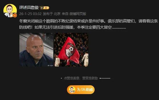 北京时间1月25日,英超第23轮,利物浦客场2-3惨遭伯恩茅斯绝杀,进入2026年以来英超还未赢过。本场比赛,利物浦在客场一度0-2落后对手,但靠着范戴克的角球破门和索博的80分钟的任意
