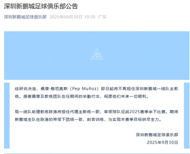 深圳新鹏城足球俱乐部官方公告称,经研究决定,佩普·穆尼奥斯(Pep Muñoz)即日起将不再担任深圳新鹏城一线队主教练。现一线队助理教练陈涛将担任代理主教练一职,率领球队征战2025赛季余下比赛。期待新鹏城全队在陈涛的带领下团结一致,刻苦训练,为实现本赛季目标拼尽全力。