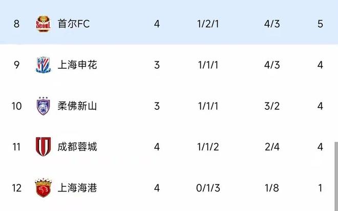 4轮结束后,作为中超的领头羊,上海海港1平3负,稳居积分榜的最后一位。而成都蓉城也跌出了前八。倘若晚些时候,上海申花面对柔佛新山出现闪失,那么中超BIG3将会出现集体掉出晋级区,甚至会出现3支球队稳居积分榜后三位的“奇观”。